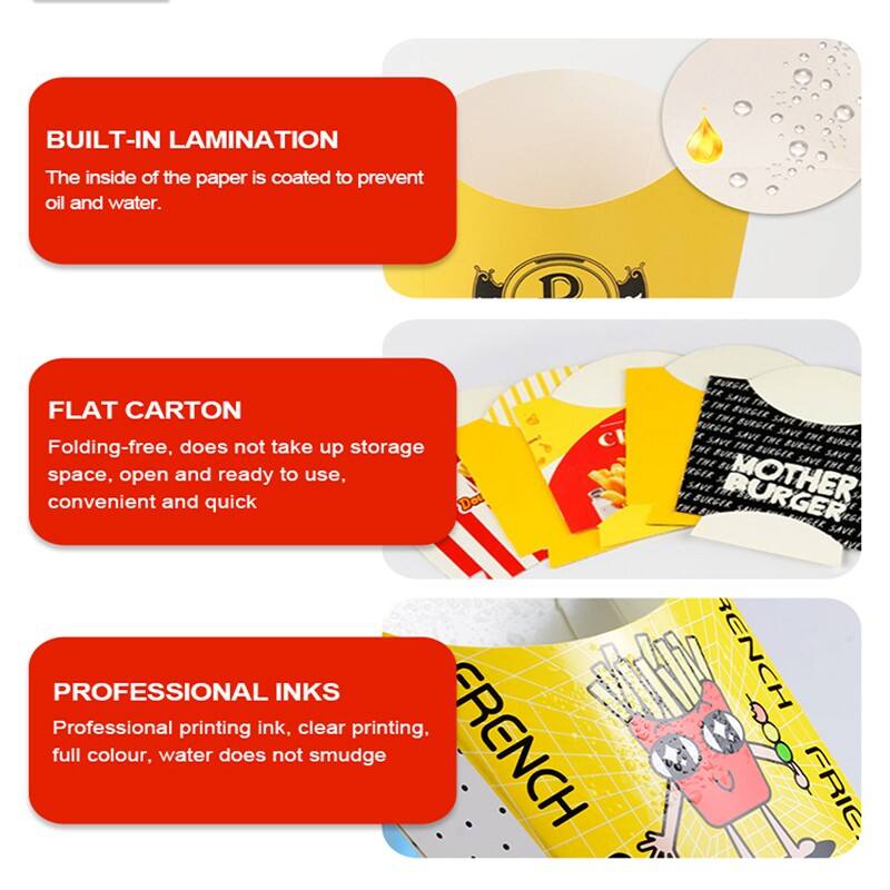 As a professional manufacturer with an in-house factory, SenAng french fries boxes are crafted from premium branded high-grammage white cardboard, coated with a PE layer or laminated with PP film, endowing them with excellent print quality and oil resistance.